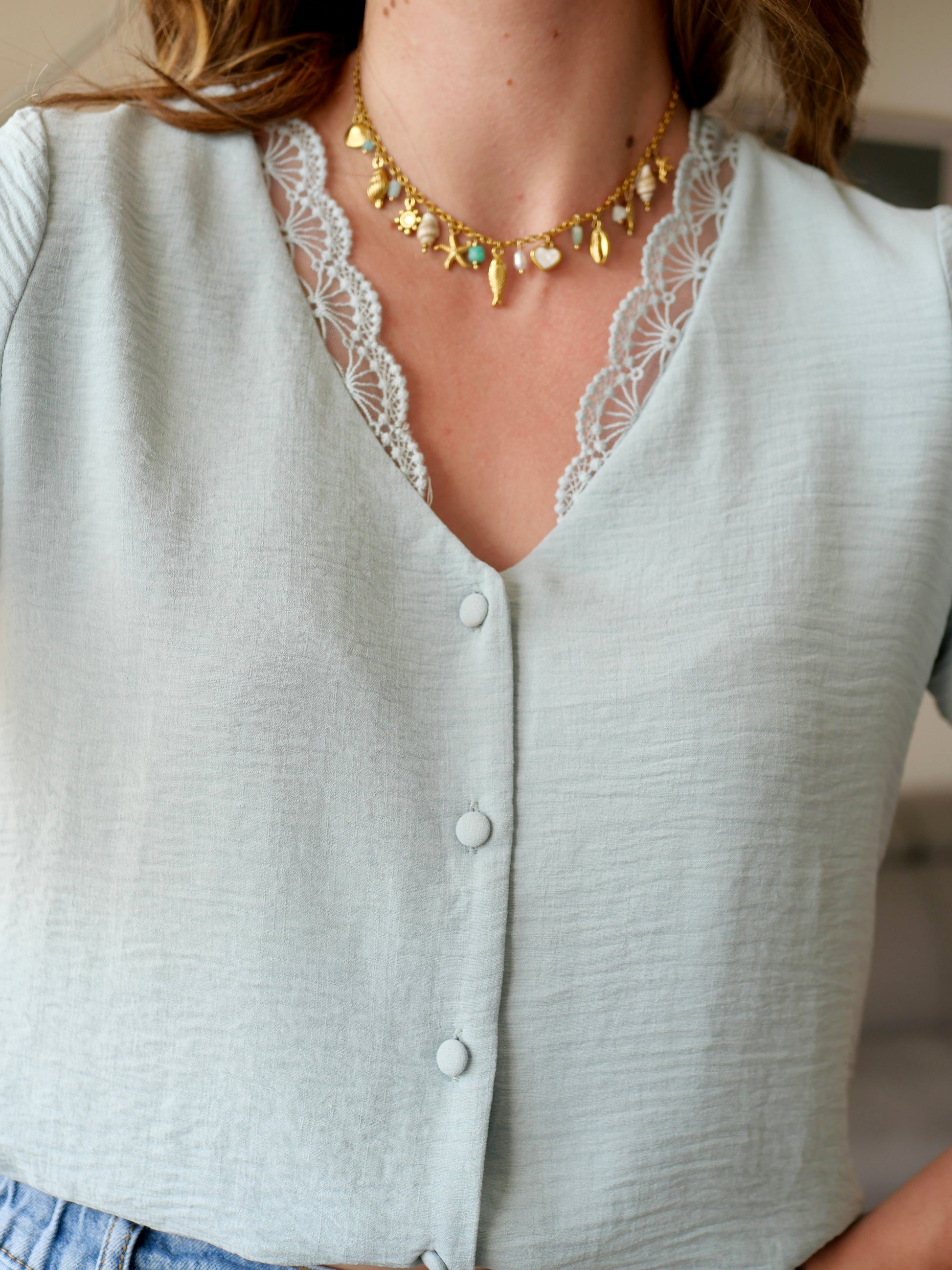 Blouse manches courtes vert d'eau avec détails de dentelle