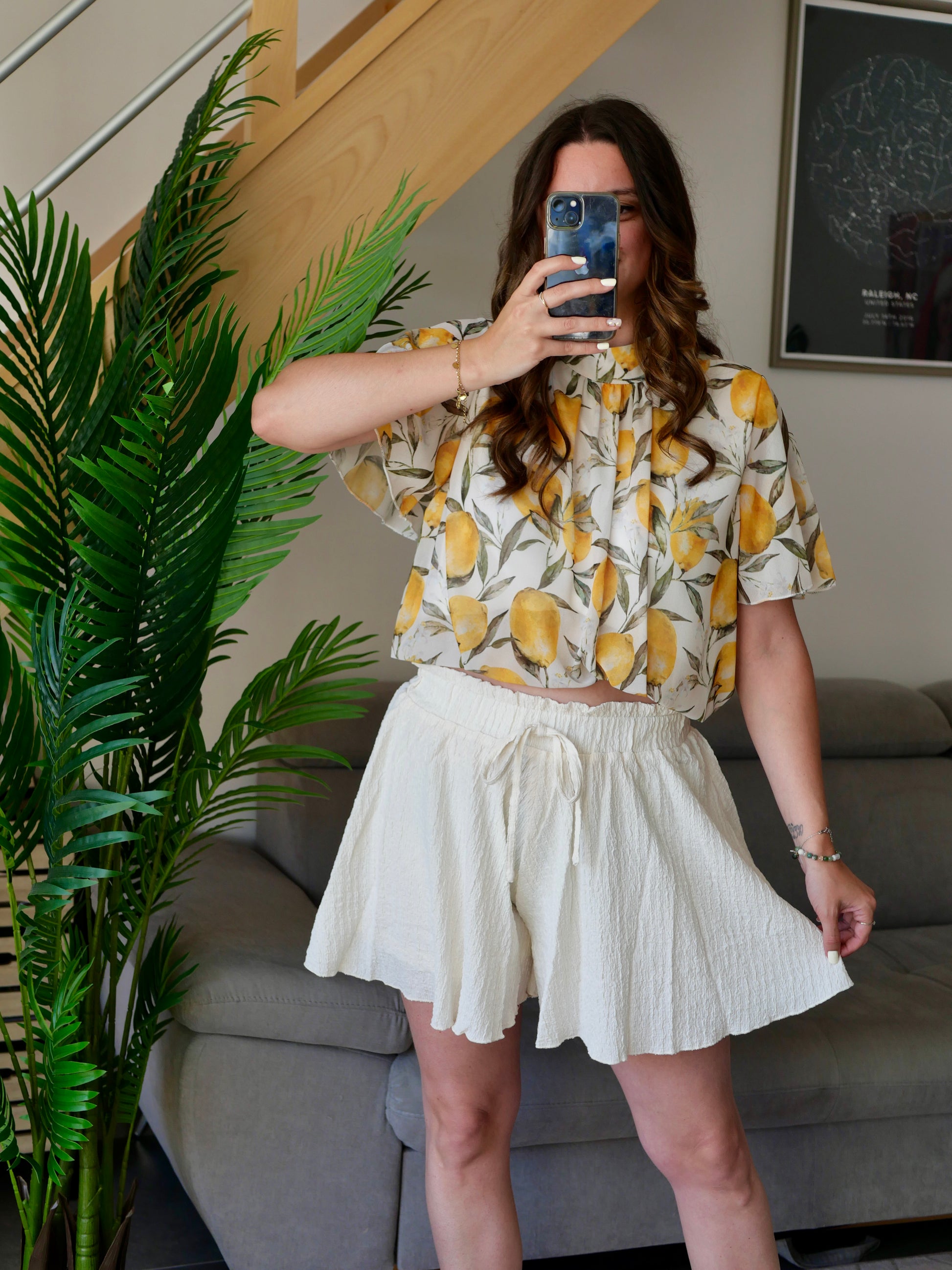 Cette petite blouse à col rond est parfaite pour la saison et vous permet d'adopter un look très chic. La blouse se ferme avec des petits boutons derrière en haut et est élastique au niveau de la taille.