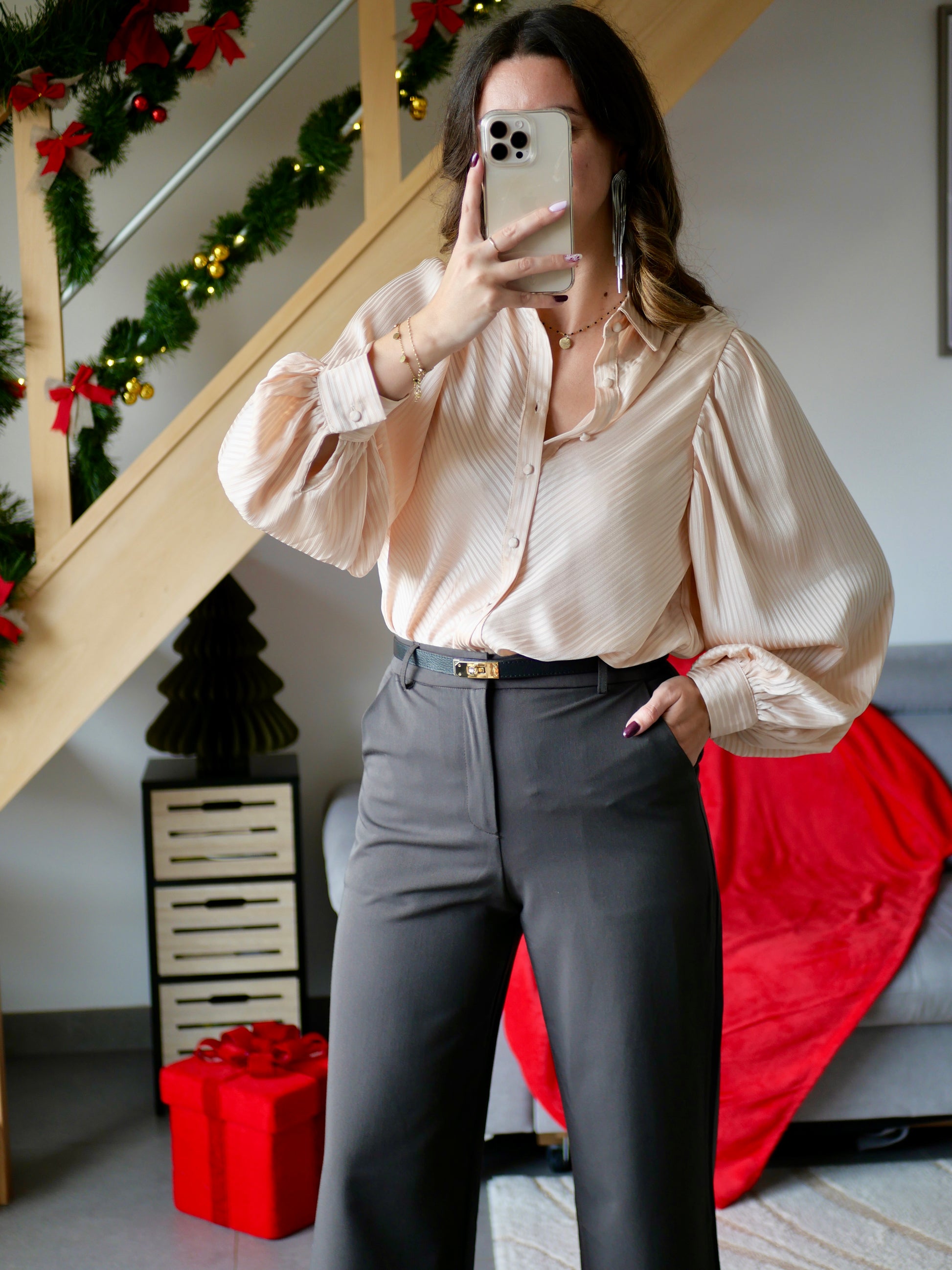 Cette chemise fluide est parfaite pour une journée au travail ou une soirée. Elle se caractérise par ses manches bouffantes, et ses fines rayures.