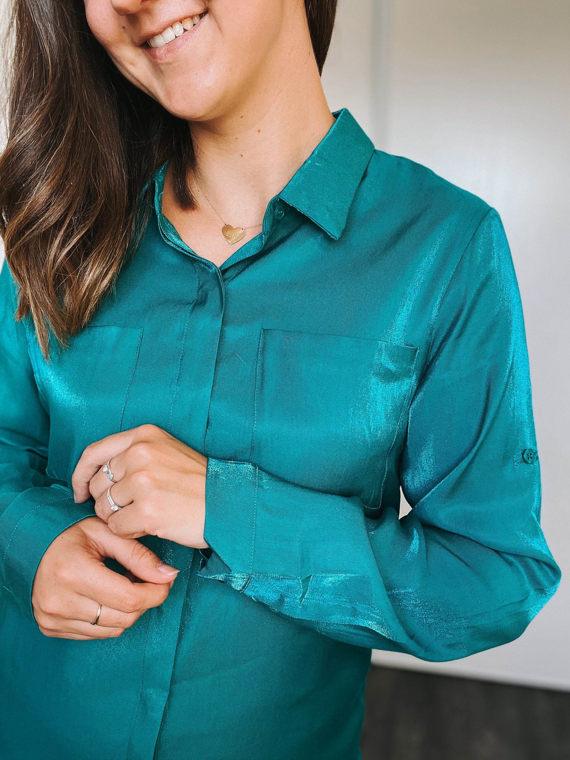 Chemise verte cintrée à manches longues mais elles peuvent être retroussées avec un bouton.