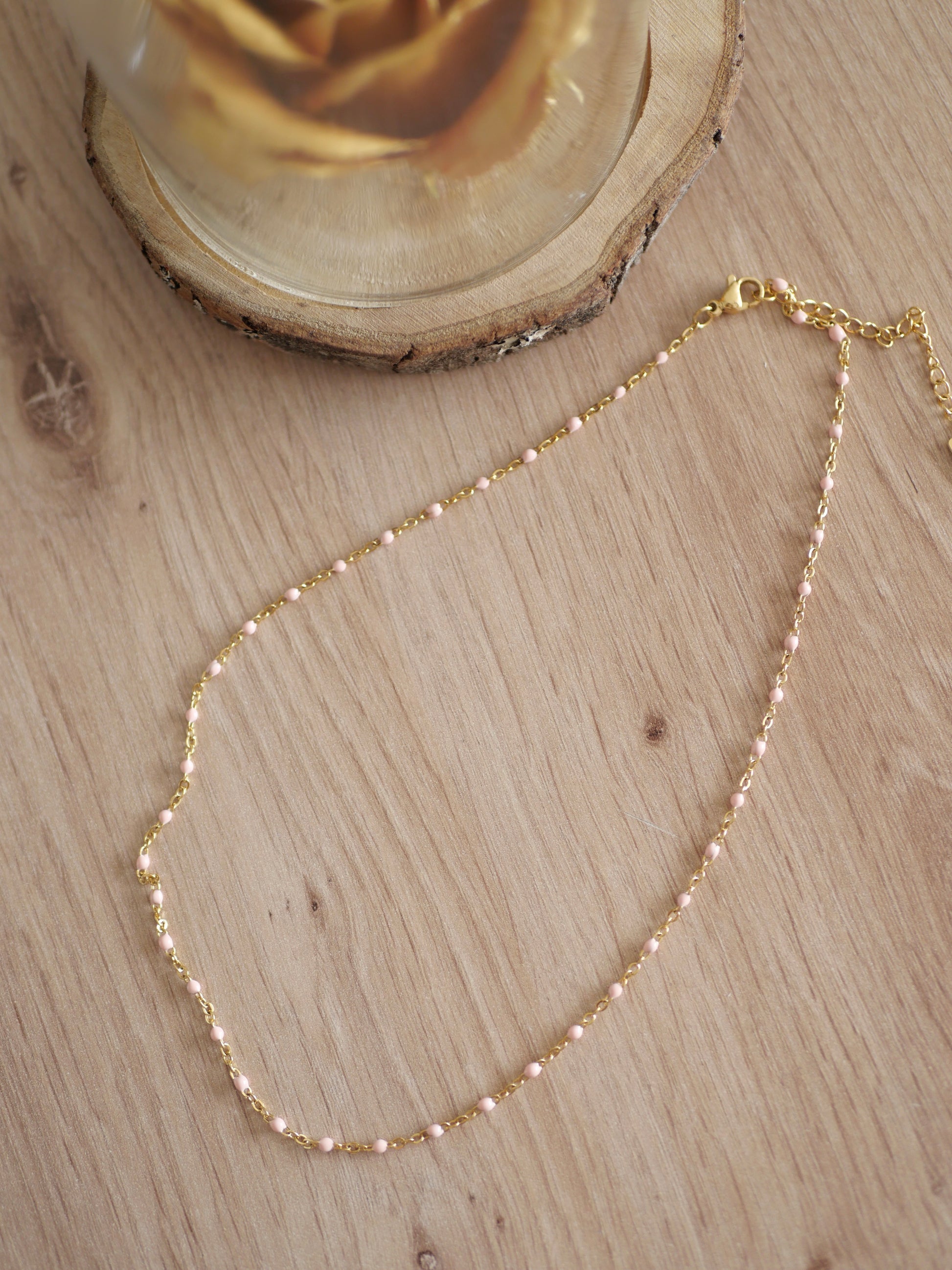 Collier en acier inoxydable composé de petites billes rose pale