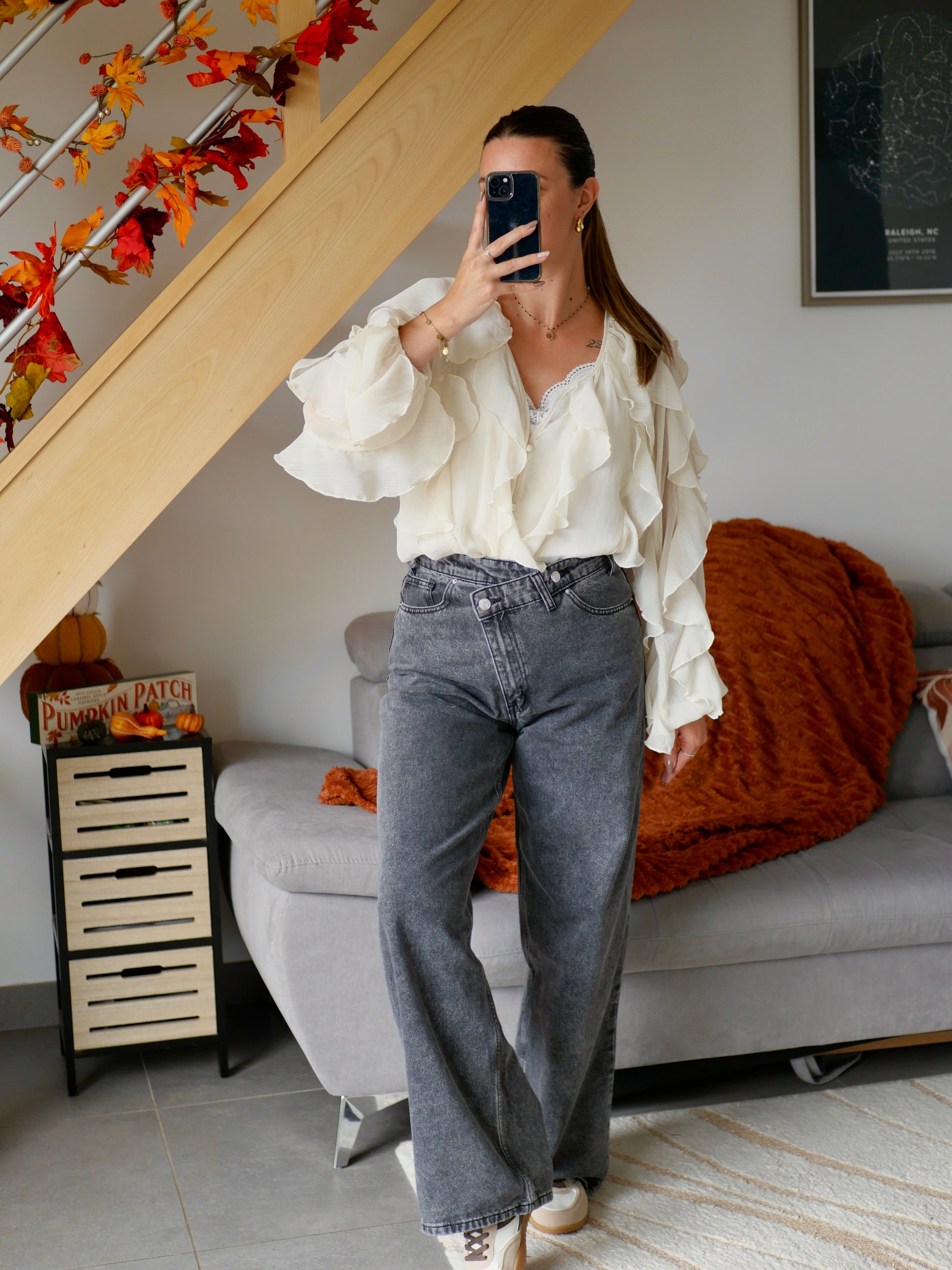 Ce jean coupe wide est hyper tendance à porter, sa coupe évasée et son asymétrie font de lui un jeans unique