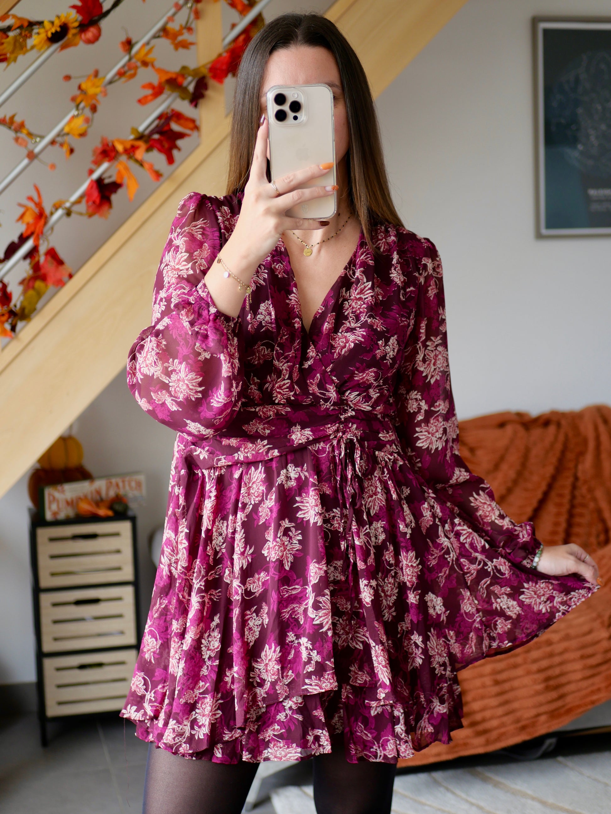 Cette robe au couleur de l'automne sera parfaite pour cette saison. Un élastique est présent à l'arrière de la robe. Elle est légèrement transparente au niveau des manches mais doublée sur le reste de la robe.