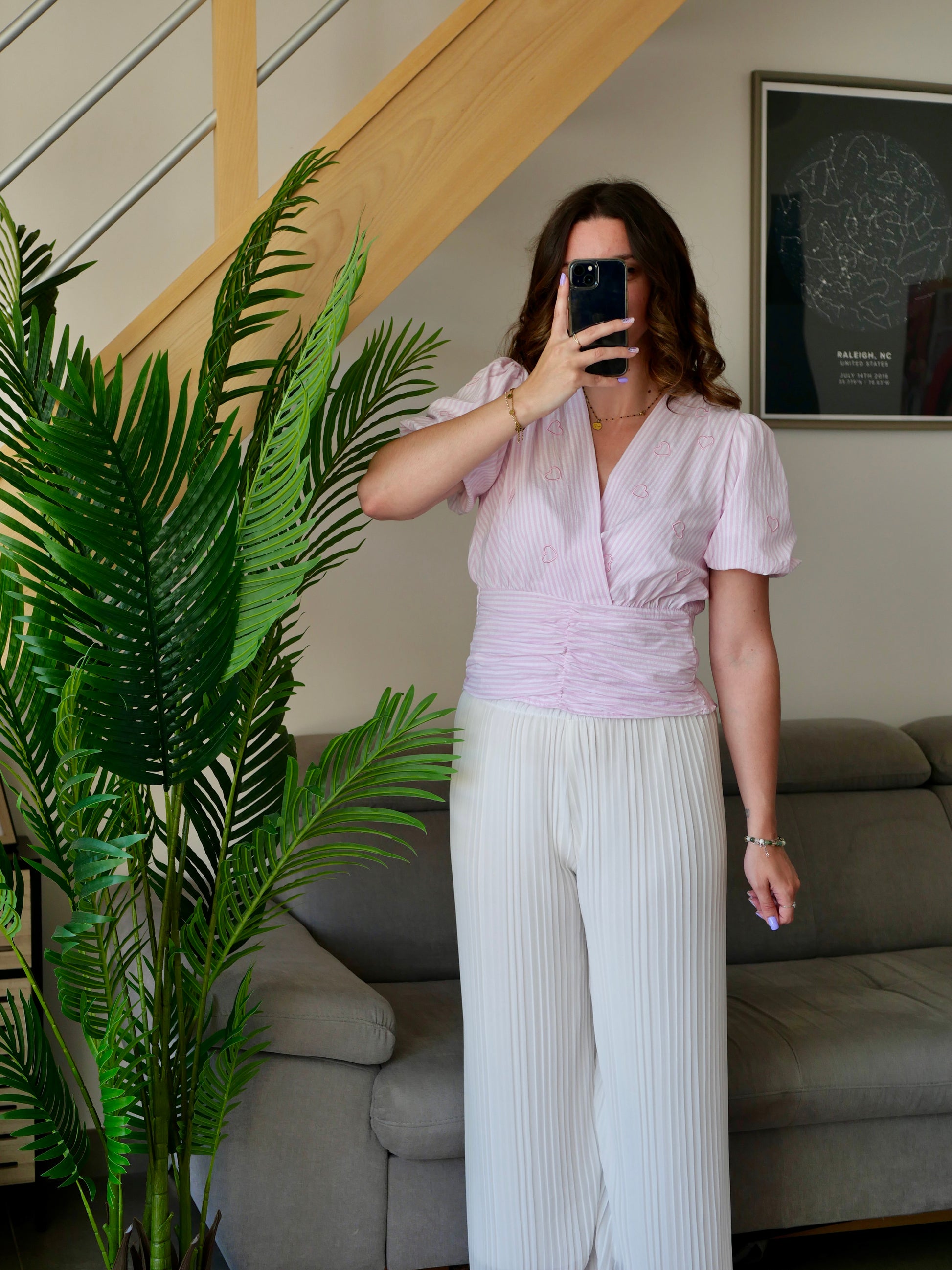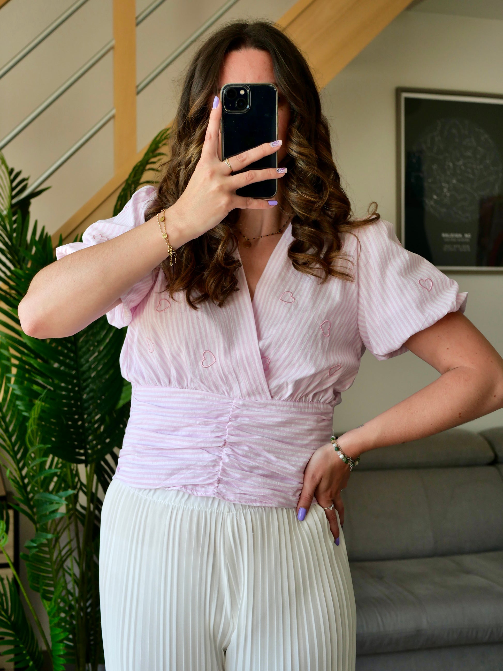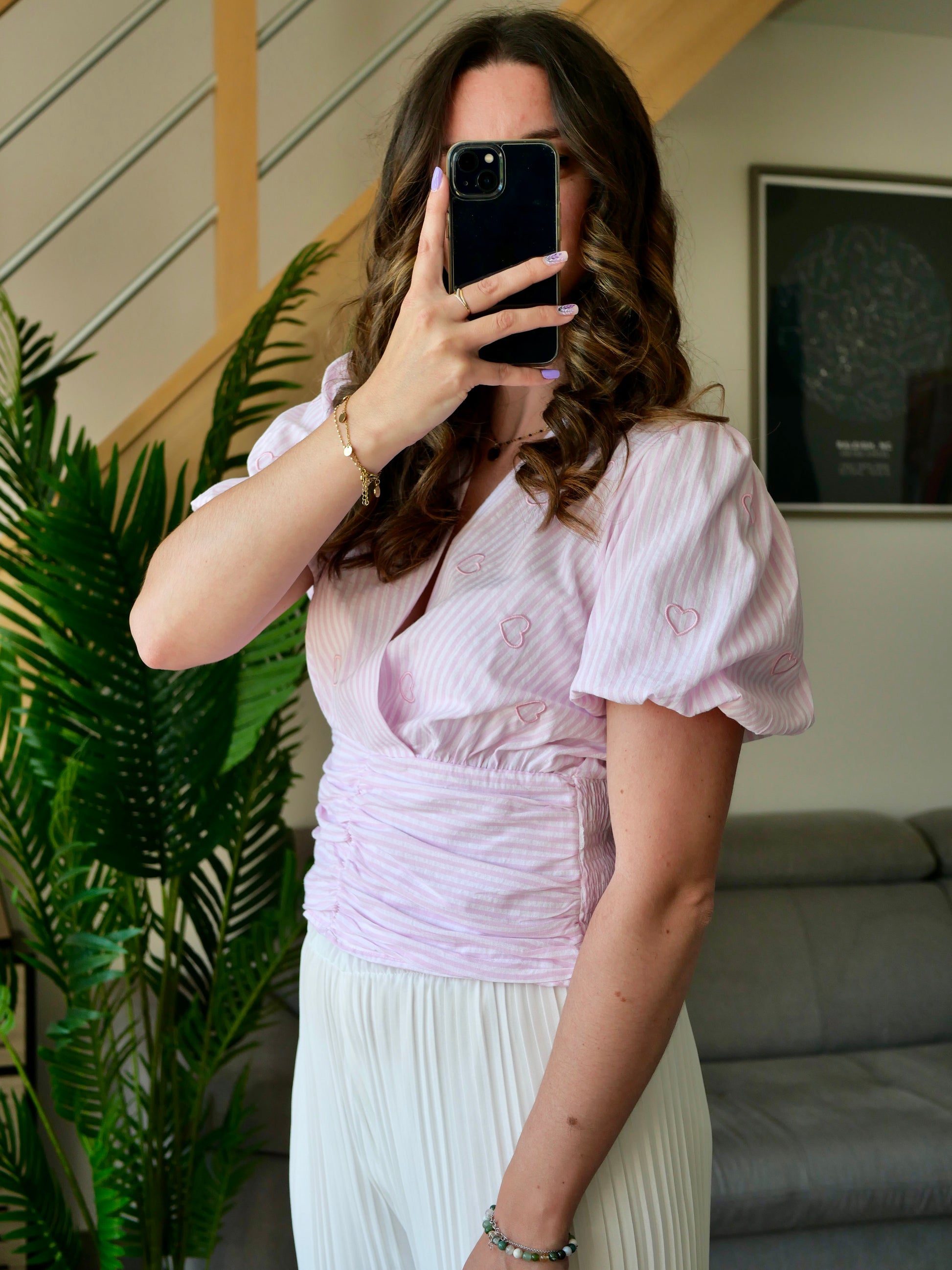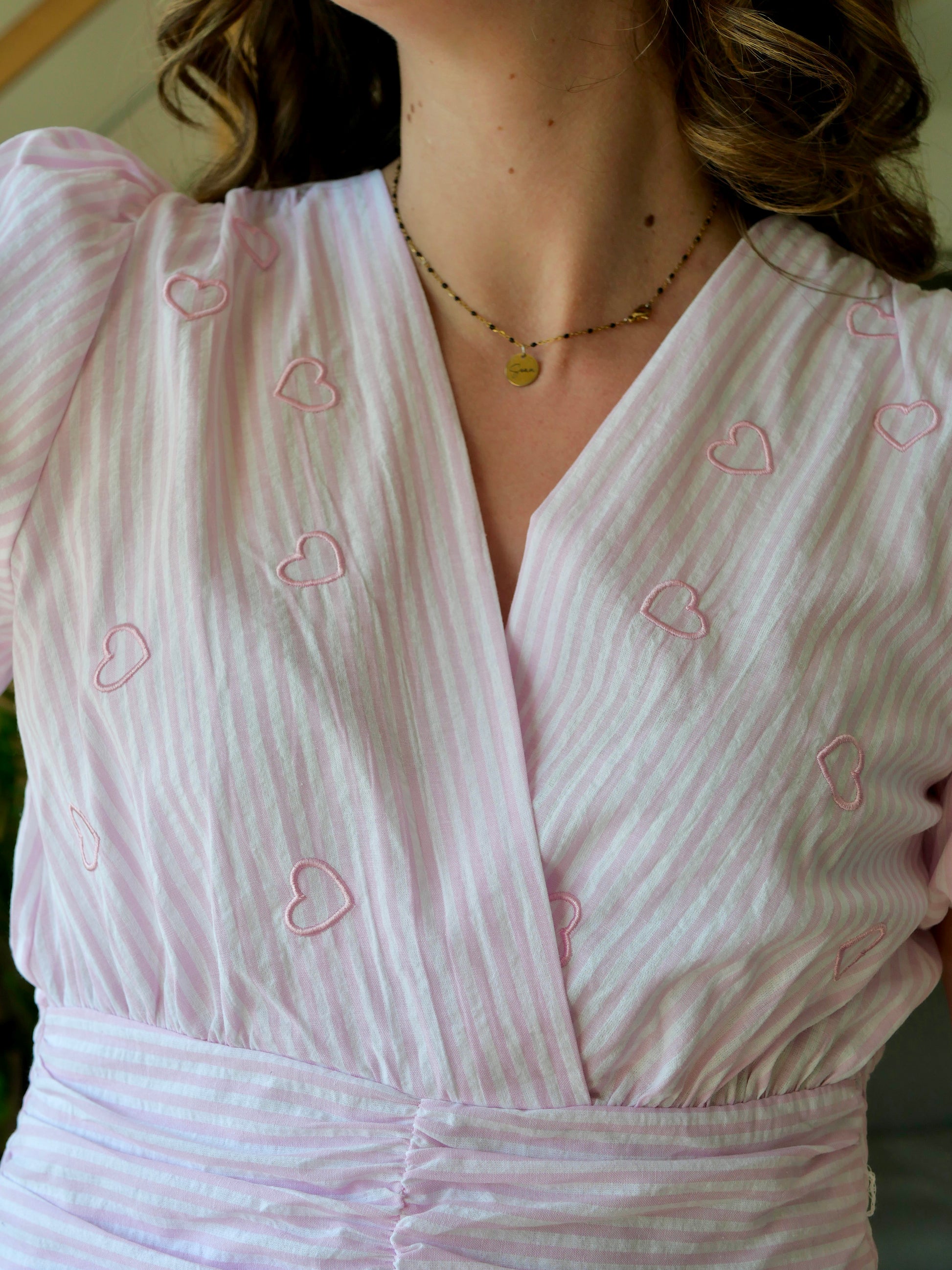 Top manches courtes rayé rose et blanc avec détails de coeur