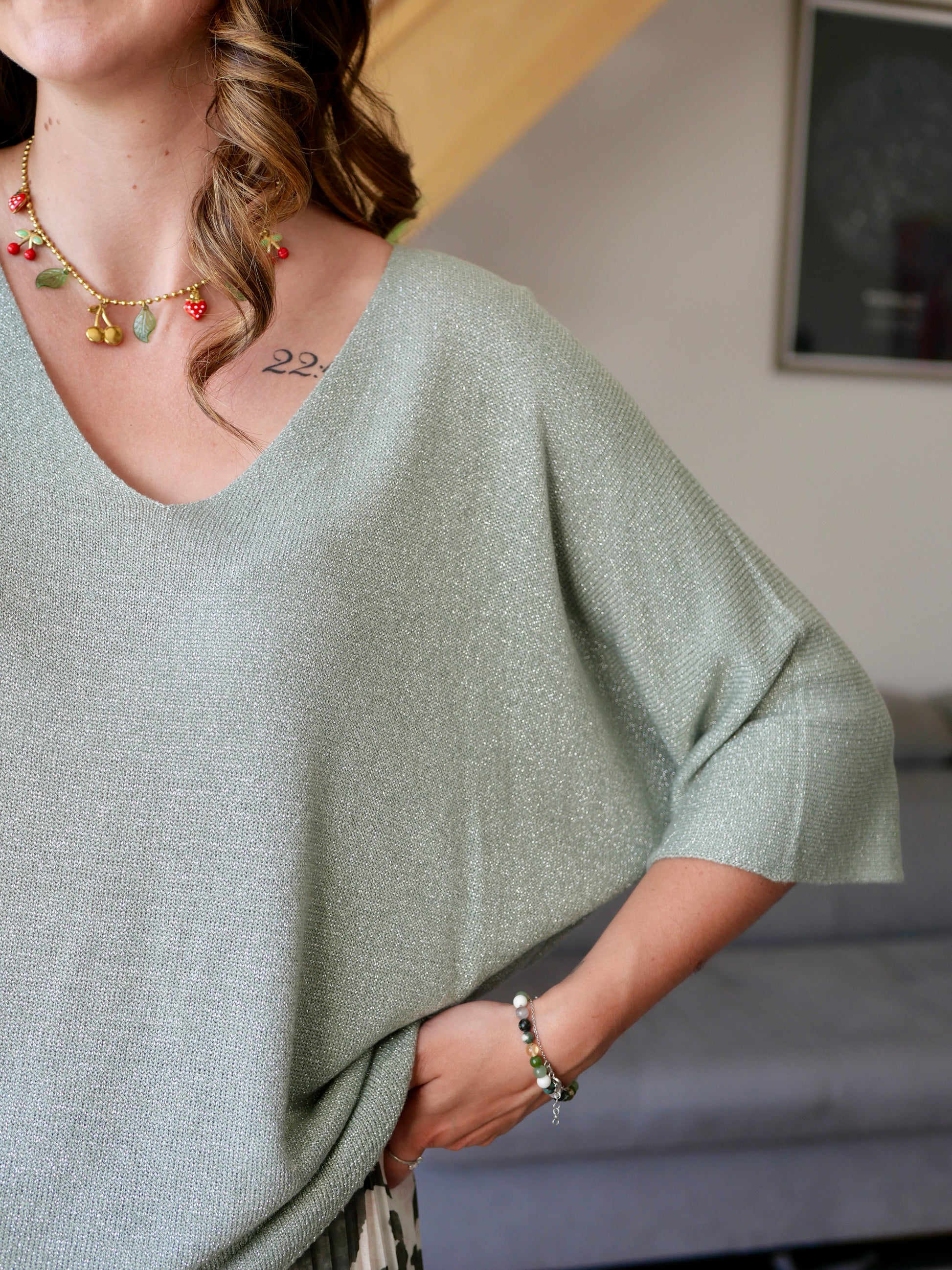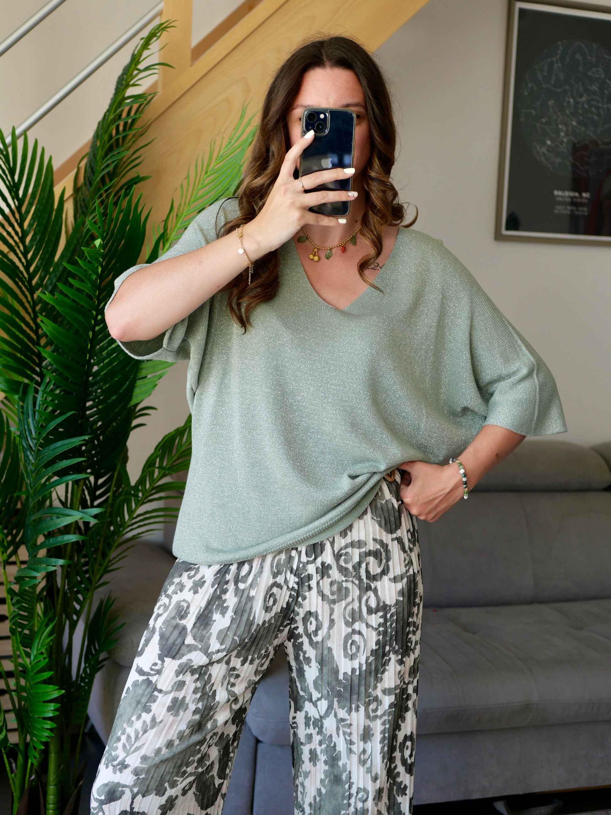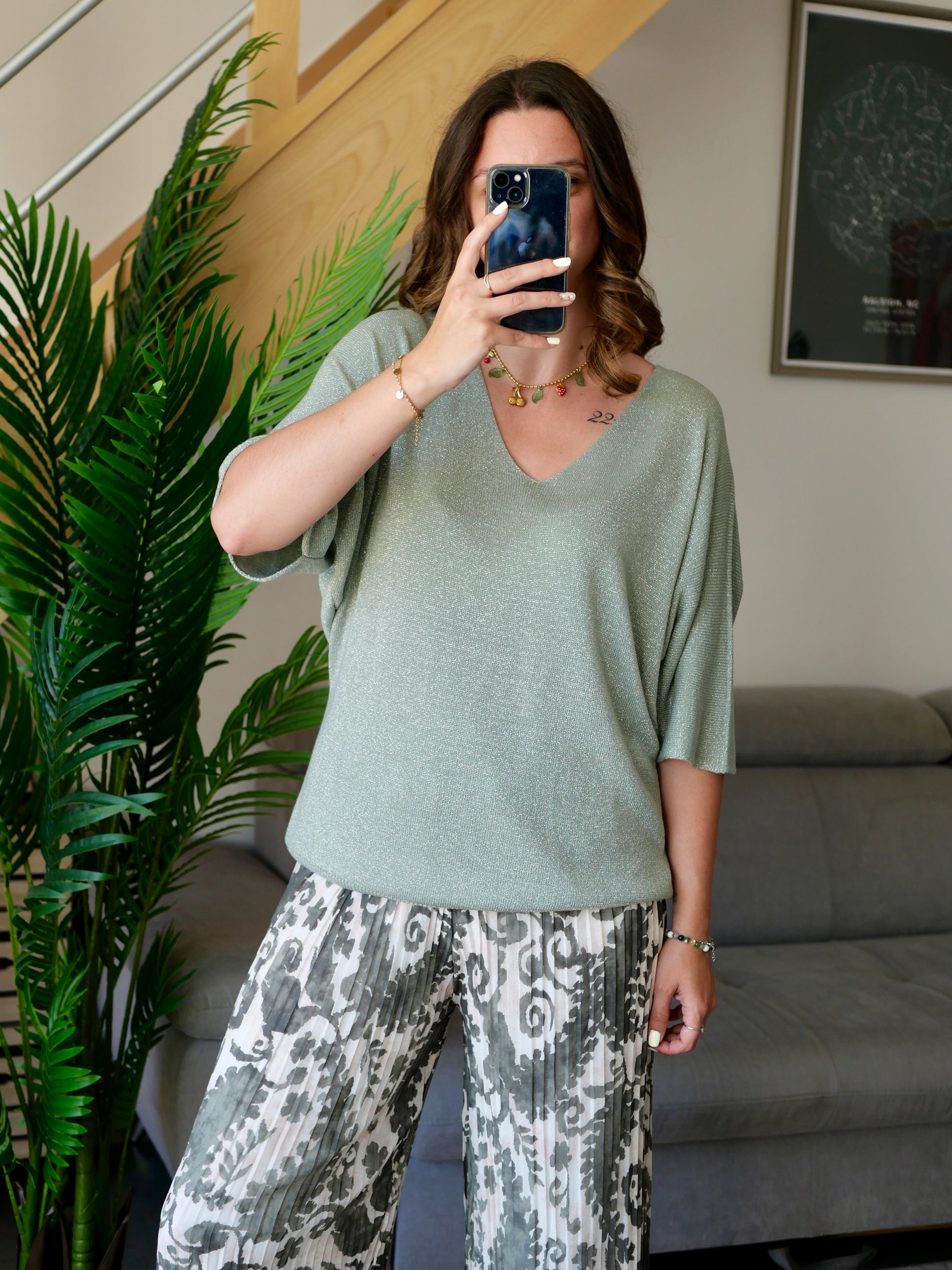 Top kaki pailleté à col V